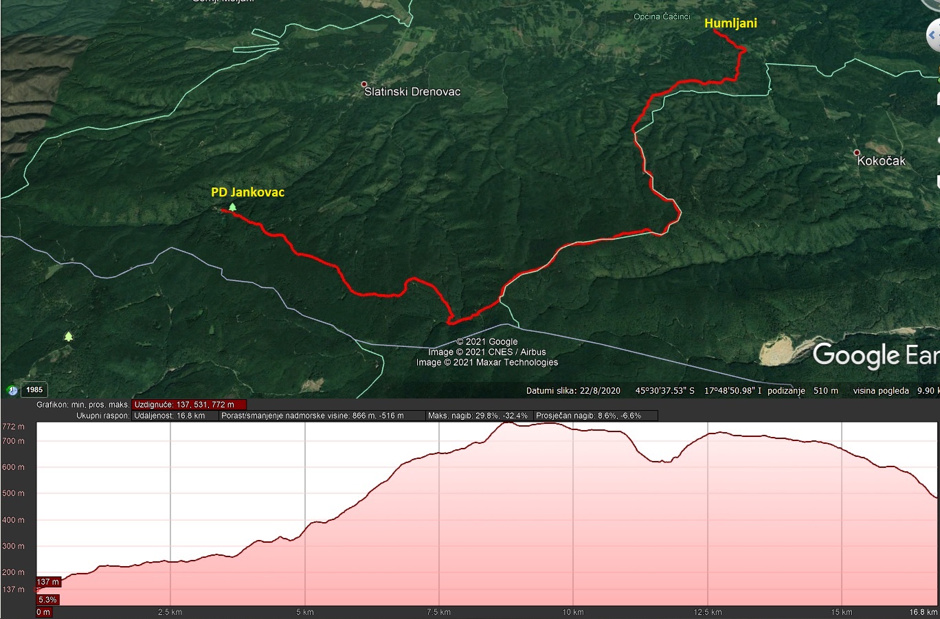 Kraj puta: Pl. dom Jankovac (475 m), koordinate: N45°31’19.74″ E17°41’4.21″